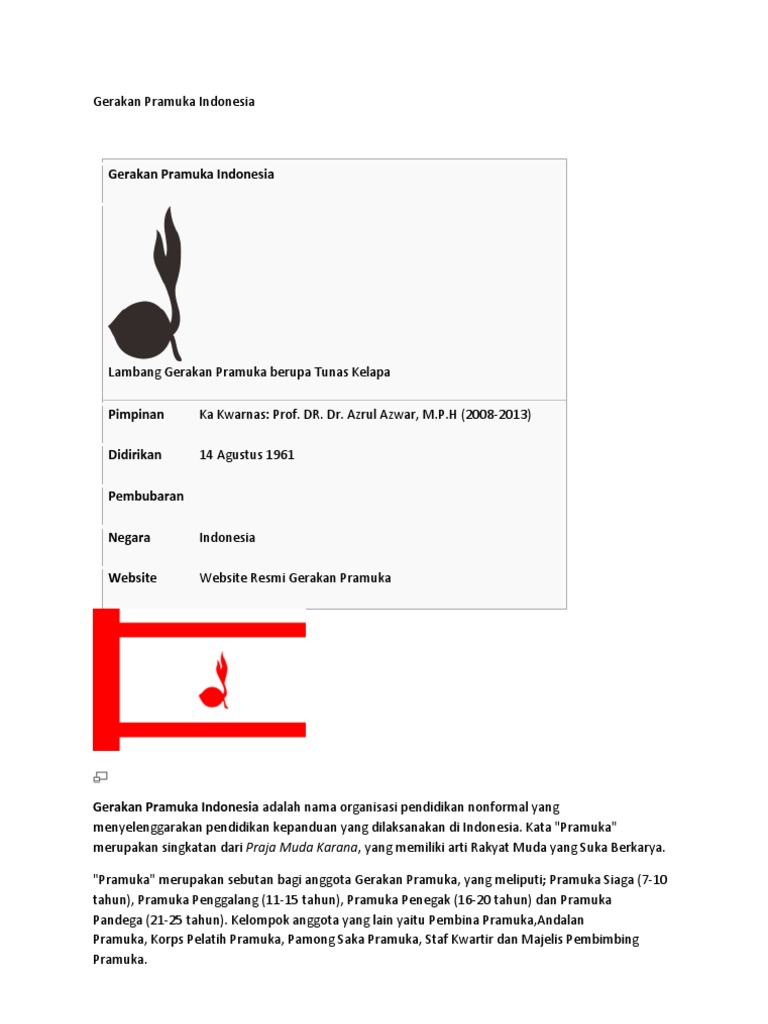 Kata pramuka merupakan singkatan dari praja muda karana yang memiliki arti rakyat muda yang suka berkarya. Sejarah awal pramuka di indonesia dan dunia terlengkap kelahiran gerakan pramuka dunia dimulai pada tahun 1907 ketika robert baden powell. Pramuka merupakan sebutan bagi anggota gerakan pramuka yang meliputi pramuka siaga pramuka penggalang pramuka penegak dan pramuka pandega. Pandega usia 21 25 tahun. Pramuka adalah singkatan dari praja muda karana yang artinya orang muda yang suka berkaryapramuka merupakan sebuah organisasi atau gerakan kepanduan boy scout yang menjadi wadah atau tempat dilakukannya proses pendidikan kepramukaan di indonesia.