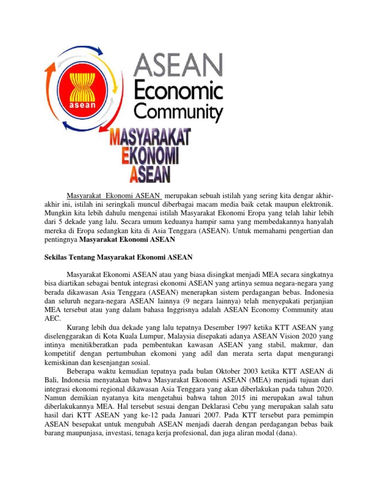 Masyarakat ekonomi asean yang akan diberlakukan pada akhir 2015 membuat persaingan tenaga kerja semakin ketat. Para negara anggota asean bersepakat untuk dapat memajukan mea masyarakat ekonomi asean dengan target yang jelas dan tersusun dalam hal pelaksanaannya. Inilah lima hal tentang mea yang wajib anda ketahui untuk menang dalam kompetisi. Istilah lain dari masyarakat ekonomi asean ialah. Mea yang merupakan singkatan dari masyarakat ekonomi asean itu sendiri. Berkaitan dengan perluasan ekonomi mea telah merencanakan peta ekonomi baru yang menguntungkan untuk negara negara asean yaitu dengan dibukanya pasar perdagangan bebas.