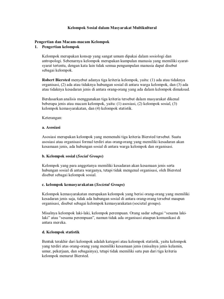 Dalam kelompok asosiasi terdapat dua kriteria yaitu persamaan kepentingan pribadi dan kepentingan bersama. Kelompok asosiasi adalah kelompok yang anggotanya mempunyai kesadaran jenis dan ada persamaan kepentingan pribadi maupun kepentingan bersama. Kelompok manusia yang dalam mekanismenya tanpa pengorganisasian atau kelompok sosial tidak teratur dikelompokkan ke dalam dua golongan besar yaitu sebagai berikut. Akan tetapi pada kelompok ini dijumpai pula kriteria lain yaitu persamaan kepentingan pribadi like interest kepentingan bersama common interest dan adanya ikatanikatan organisasi formal. Sejak dilahirkan manusia telah memiliki dua hasrat pokok dalam dirinya yaitu keinginan untuk menjadi satu dengan manusia lain dan keinginan untuk menjadi satu dengan suasana alam disekitarnya.