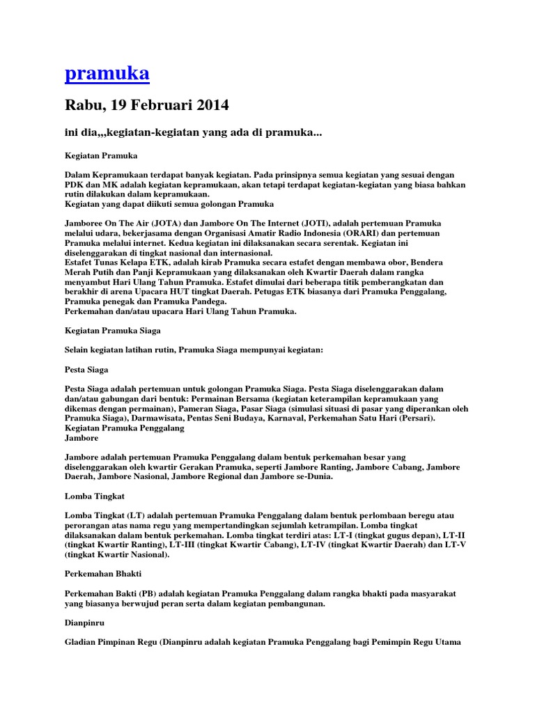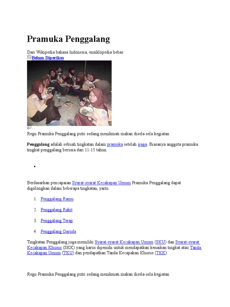 Pramuka penggalang merupakan penggolongan sekaligus sebutan bagi anggota pramuka yang telah berusia antara 11 hingga 15 tahun. Sebutan untuk pendidik dalam gerakan pramuka. Disebut pramuka penggalang karena sesuai dengan kiasan pada masa penggalangan perjuangan bangsa indonesia yaitu ketika rakyat indonesia menggalang dan mempersatukan dirinya untuk mencapai kemerdekaan dengan adanya peristiwa bersejarah berupa konggres pemuda indonesia yang dikenal dengan. Satuan satuan terkecil dalam pramuka penggalang disebut regu dan kesatuan dari beberapa regu disebut pasukan. Setiap anggota pramuka penggalang dikelompokkan dalam satuan satuan kecil yang disebut regu. Pramuka usia 11 15 tahun.