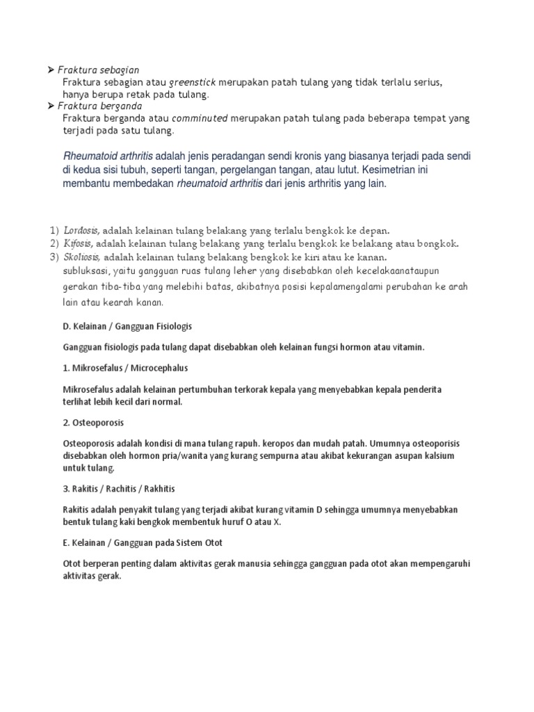 Gangguan metabolisme akibat fenilketorunia. Gangguan kelainan dan penyakit pada sendi dislokasi. Tulang belakang terdiri dari tulang kecil yang bertumpuk satu sama lain. Normalnya tulang belakang memang agak sedikit melengkung untuk membantu pergerakan tubuh. Bagian yang bersifat cair disebut plasma darahlebih dari setengah bagian darah merupakan plasma darah. Penderita stroke memiliki wajah yang asimetri.
