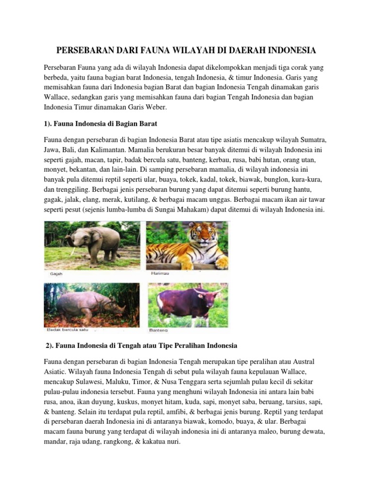 Jenis fauna asiatis atau contoh hewan asiatis antara lain adalah. Fauna dengan persebaran di bagian indonesia barat atau tipe asiatis mencakup wilayah sumatra jawa bali dan kalimantan. Fauna australis fauna ini terdapat di irian jaya dan pulau pulau disekitarnya. Mamalia berukuran besar banyak ditemui di wilayah indonesia ini seperti gajah macan tapir badak bercula satu banteng kerbau rusa babi hutan orang utan monyet bekantan dan lain lain. Kuskus beruang ailurops ursinus merupakan salah satu jenis kuskus yang hanya dapat ditemukan di sulawesikuskus beruang memiliki berat 7 kg dan tinggi sekitar 12 m untuk ukuran dewasa. Tempat ini memiiki fasilitas penunjang seperti pusat penelitian tumbuhan dan hewan jembatan gantung menara pengintai sampan dan lain lain.