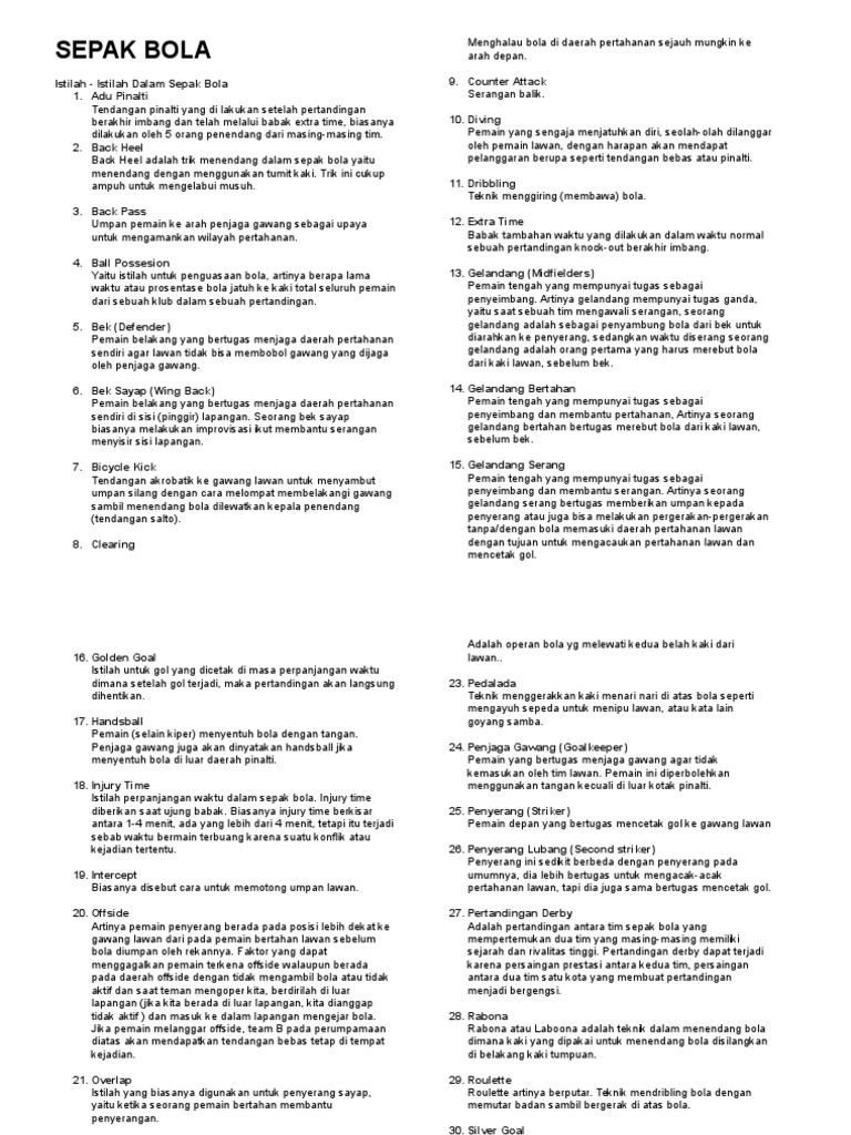 Pada dasarnya kedua teknik tersebut tergolong dalam teknik dasar permainan sepak bola yang juga dapat kita pelajari di hampir semua jenjang sekolah. Buat yang suka dan sering nonton sepak bola mungkin enggak akan bingung dengan istilah dalam olahraga ini. Demikian istilah dalam sepak bola jika anda memnag mencari istilah tersebut atau ingin menambahkan silahkan saja komentar disini ya. Istilah istilah dalam sepak bola sepak bola menjelma menjadi salah satu olahraga terpopuler di duniajutaan bahkan milyaran orang bisa terfokus pada suatu pertandingan besar sepak bola. Seiring dengan perkembangan permainan sepak bola dan peraturan yang semakin ketat seakan muncul istilah baru.