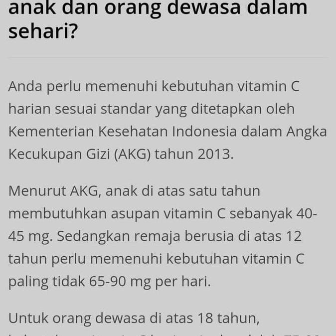 Kebutuhan harian dan batas asupan vitamin c asam askorbat di bawah ini adalah kebutuhan harian vitamin c per hari yang dianjurkan berdasarkan usia dan jenis. Anak usia lebih dari 11 tahun. Dalam akg telah diatur standar kebutuhan ini. Namun sebagai pedoman umumnya kementerian kesehatan lewat permenkes 75 tahun 2013 merekomendasikan angka kebutuhan vitamin c harian orang indonesia sebagai berikut. Batas atas aman konsumsi vitamin c adalah 2000 miligram per hari namun hanya dengan 500 miligram setiap hari saja sebenarnya sudah memberi hasil yang optimal lanjutnya. Akan tetapi jangan lupa untuk konsultasi dulu ke dokter sebelum mulai minum suplemen vitamin apa pun.