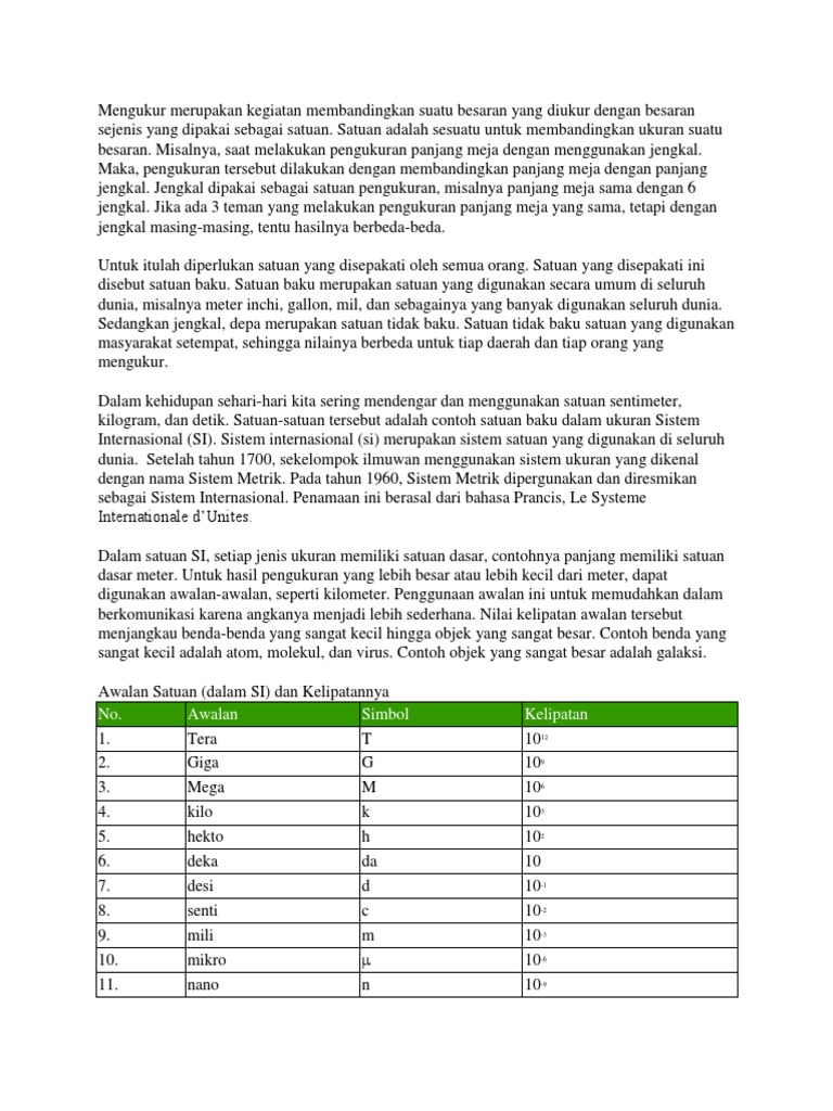 Nah ananda kelas 7 smpmts akan belajar kembali dengan judul pelajaran baru pengukuran dalam kehidupan srhari hari. Satuan baku dan satuan tidak baku. Satuan tidak baku adalah satuan yang tidak diakui secara internasional hanya digunakan pada wilayah tertentu saja. Sridadi 2007 pengukuran adalah suatu prose yang dilakukan secara sistematis untuk memperoleh besaran kuantitatif dari suatu obyek tertentu dengan menggunakan alat ukur yang baku. Satuan dibedakan menjadi dua jenis yaitu satuan tidak baku dan satuan baku.