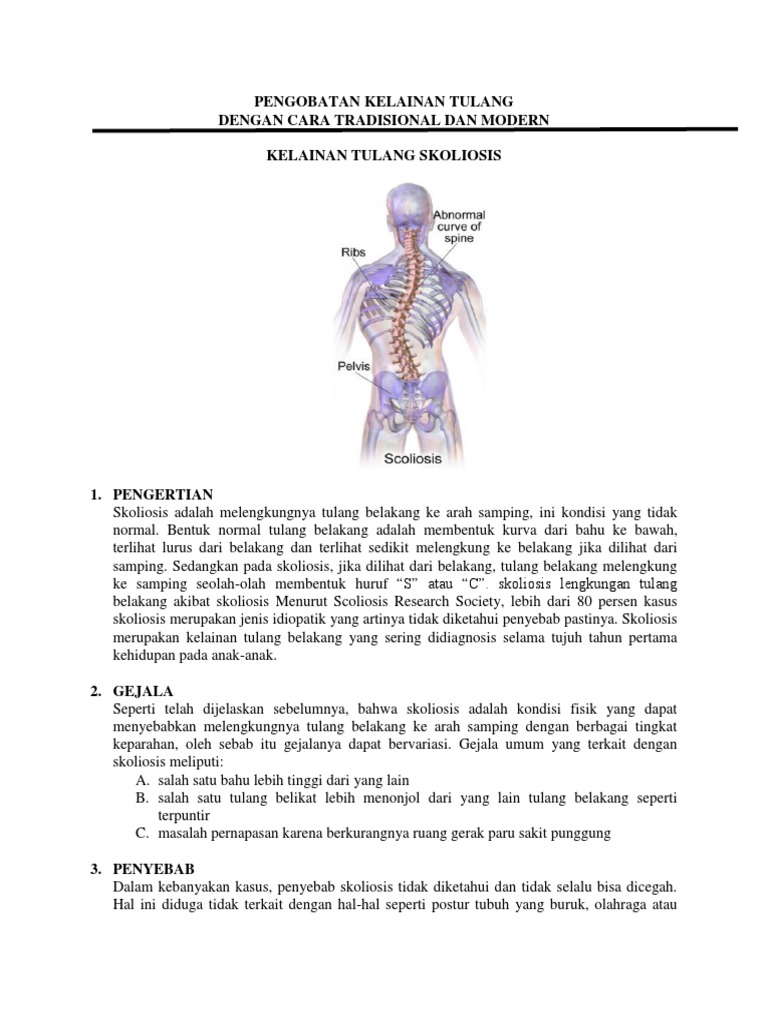 Tulang belakang berfungsi untuk menopang tubuh bagian atas dan membentuk postur tubuh. 11 latar belakang jenis kelainan pada tulang punggung manusia bermacam macam bergantung pada faktor umur kebiasaan dan kecelakaanvirusbakteri. Tulang belakang terdiri dari ruas ruas tulang yang tersusun bertumpuk satu sama lain. Hal ini akan menyebabkan badan akan bengkok membentuk huruf s. Kelainan skoliosis sebanyak 75 hingga 85 tidak diketahui penyebabnya idiofatik sedangkan terjadi penyebab terjadi skoliosis adalah efek samping dari kelainan seperti sindrom marfan sindrom down distrofi otot atau penyakit lainnya yaitu sekitar. Kelainan pada tulang punggung yang terlalu membengkok ke dalam.