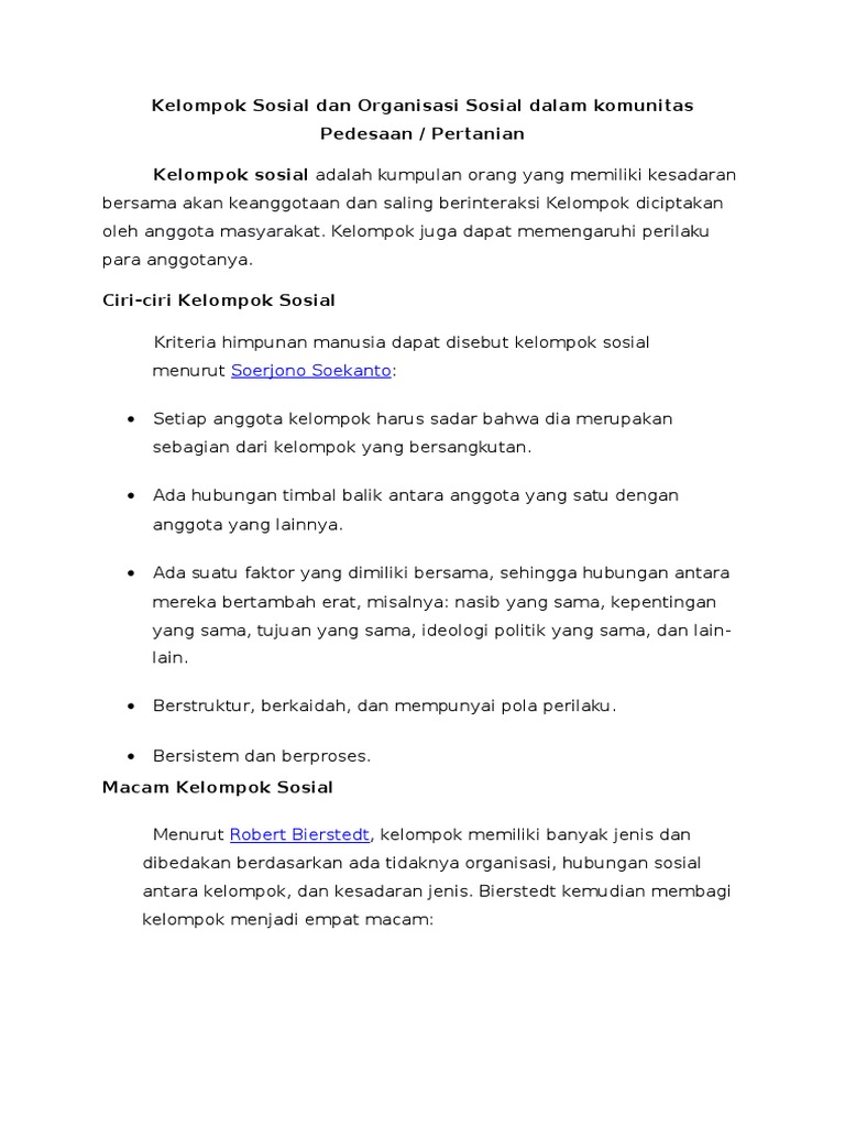 Contohnya ialah kenalan tetangga teman sekota teman sepermainan dll. Misalnya bentuk kesatuan sosial yang bersifat genelogis dan teritorial antara lain huta di sumatra utara nagari di sumatra barat uma di papua dan dalu di flores. Adanya kesadaran bahwa kita termasuk bagian dari kelompok yang bersangkutan. Kelompok sosial juga mempunyai syarat dan ciri ciri menurut pakar sosial indonesia soerjono soekanto kumpulan manusia bisa dikatakan sebagai kelompok sosial apabila memiliki beberapa persyaratan. Kelompok sosial atau social group adalah himpunan atau kesatuan manusia yang hidup bersama karena adanya hubungan di antara mereka. Kelompok sosial atau yang dalam bahasa inggrisnya disebut sebagai social group merupakan suatu kelompok manusia yang hidup bersama yang disatukan atas suatu nilai kesamaan tertentu.