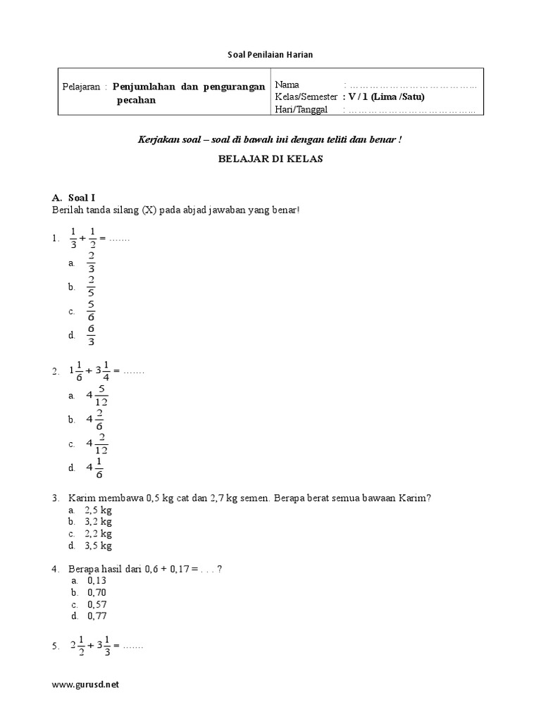 7 9 5. Kerjakan soal soal di bawah ini dengan teliti dan. Selanjutnya ialah pecahan campura. Untuk operasi penjumlahan dan pengurangan ini langkah langkahnya sama. Soal penilaian harian pelajaran. Sebelum itu kita harus tahu terlebih dahulu apa pengertian dari bilangan pecahan.