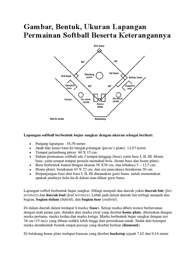 Lapangan softball berbentuk. Ukuran lapangan softball tersebut telah disesuaikan dengan standar nasional dan internasional. Ini karena ukuran bola softball yang digunakan. Marka berbentuk bujur sangkar dengan sisi 38 cm 15 inci yang dibuat sedikit lebih tinggi dari permukaan tanah. Lapangan softball berbentuk bujur sangkar dengan ukuran sebagai berikut. Jarak dari home base ke tempat pelempar pitcers plate. Beberapa peraturan permainan softball adalah.