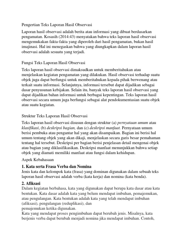 Laporan hasil pengamatan dapat dibuat berdasarkan. Menurut kosasih 201443 menyatakan bahwa teks laporan hasil observasi mengemukakan fakta fakta yang diperoleh dari hasil pengamatan bukan hasil imajinasi. Miyaki242 miyaki242 5 menit yang lalu ppkn sekolah menengah atas 5 pts. Laporan adalah suatu bentuk hasil dari sebuah pengamatan yang dilakukan dan bertujuan untuk menginformasikan hasil yang diperoleh tersebut kepada orang banyak. Simpulan merupakan akhir dari uraian panjang suatu teks laporan hasil observasi. Kemudian deskripsi bagian berisi hasil pengamatanmu tentang kucing secara terperinci. Menyusun teks berdasarkan gagasan utama yang telah dibuat diawali dengan paragraf pernyataan umum lalu ke bagian isi setelah membuat klasifikasi secara umum langkah berikutny yaitu menjabarkan klasifikasi tersebut berdasarkan hasil pengamatan.