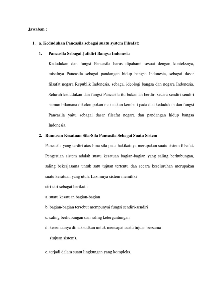 Pengertian system adalah suatu kesatua bagian bagian yang saling berhubungan saling bekerjasama untuk satu tujuan tertentu dan secara keseluruhan merupakan suatu kesatuan yang utuh. Sila pertama dalam pancasila adalah ketuhanan yang maha esa berlambang bintang emas dengan lima sudut serta berlatar belakang hitam. Tidak dapat disatukan satu sama lain b. Pancasila terdiri atas lima sila yang setiap silanya. Pancasila merupakan rumusan dan pedoman kehidupan berbangsa dan bernegara bagi seluruh rakyat indonesia. Pancasila terdiri dari lima sila yang memiliki nilai nilai berbeda pada setiap silanya.