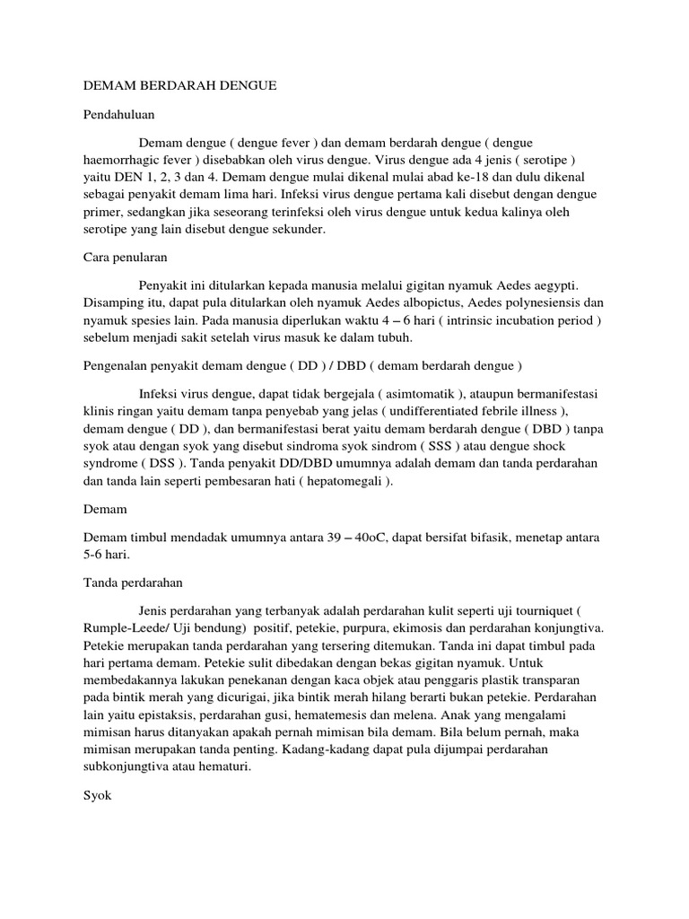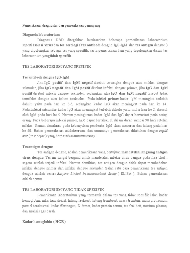 Penanda serologi untuk infeksi primer dalam kasus dbd yaitu. Pada infeksi primer didapatkan kadar antibodi igm setelah hari ke 4 5 demam dan antibodi igg akan timbul setelah hari ke 14 demam dan bertahan dalam jangka waktu yang lama. Pemeriksaan serologi dapat membantu dalam membuktikan adanya infeksi denv. Kedua antibodi ini muncul 5 7 hari setelah infeksi. Demam denguedf dan demam berdarah denguedbd dengue haemorrhagic fever dhf adalah penyakit infeksi yang disebabkan oleh virus dengue dengan manifestasi klinis demam nyeri otot danatau nyeri sendi yang disertai lekopenia ruam limfadenopati trombositopeniadan diathesis hemoragik. Pada infeksi primer didapatkan kadar antibodi igm setelah hari ke 4 5 demam dan antibodi igg akan timbul setelah hari ke 14 demam dan bertahan dalam jangka waktu yang lama. Jika dilihat dari beratnya dbd pada kasus ini termasuk dbd derajat 2 sedang.