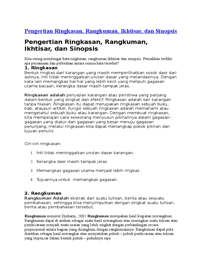 Ringkasan merupakan sebuah penyajian karangan atau peristiwa yang panjang kedalam bentuk yang lebih kecil singkat dan efektif. Ringkasan adalah penyajian karangan yang panjang dalam bentuk singkat dan efektif. Penyajian karangan yang panjang dalam bentuk yang singkat dan efektif disebut. Bagian kedua dari atas adalah neck atau leher berita bagian ini adalah urutan yang sangat pentingbagian ini disebut neck atau leher karena umumnya merupakan peralihan alur atau penyambung alur ide berita yang ada pada bagian lead atau kepala berita untuk dilanjutkan pada gagasan gagasan yang tertuang pada bagian berikutnya yang menempati derajat prioritas lebih rendah. Ringkasan merupakan inti sari dari sebuah karangan tanpa ditambahi hiasan. Ringkasan tersebut juga dapat meliputi ringkasan sebuah buku bab ataupun artikel.