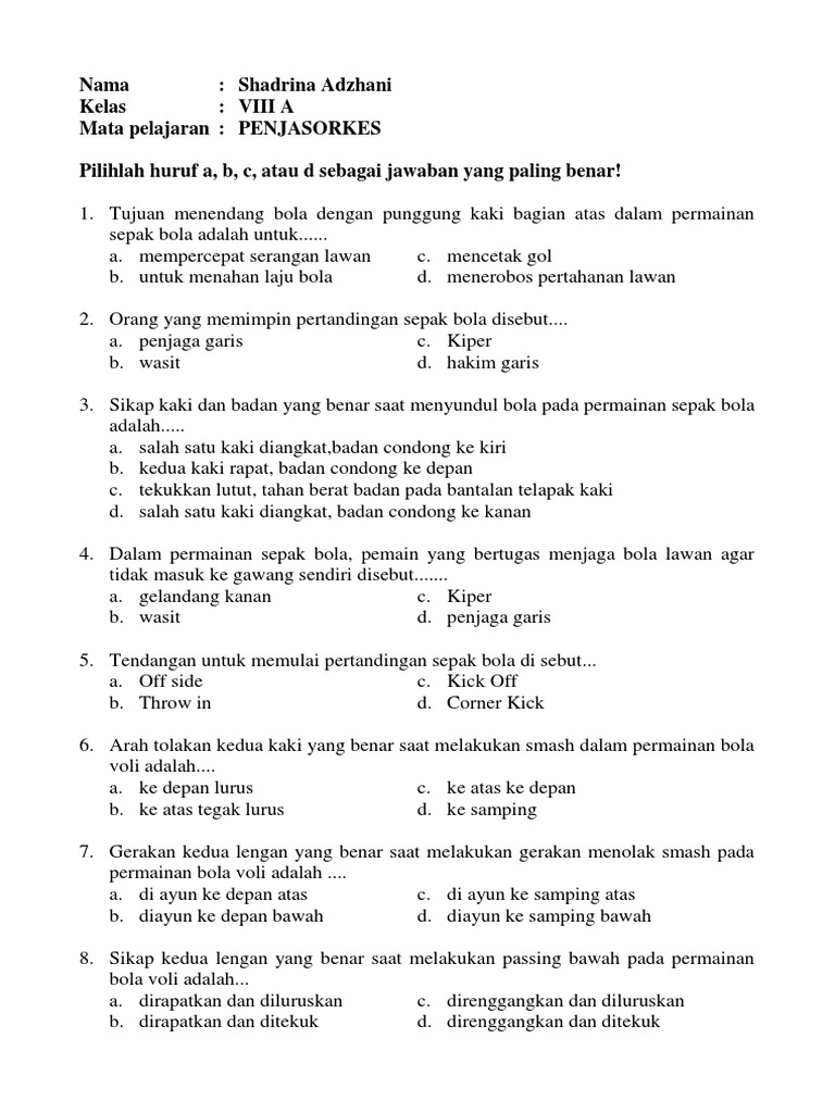 Soal dan kunci jawaban pas penjaskes smp kelas 8 kurikulum 2013 tahun pelajaran 20192020 soal penilaian akhir semester pas sangat berarti bagi bapak dan ibu guru untuk dijadikan referensi pada saat penilaian akhir semester tahun berikutnya. Bola yang diterima oleh kedua tangan yang dirapatkan dan diayun dari arah bawah ke atas dalam permainan bola voli disebut a.