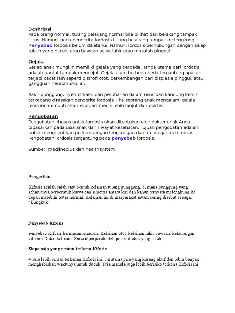 Skoliosis adalah suatu gangguan pada tulang belakang di mana tulang belakang melengkung ke samping baik kiri atau kanan yang membuat penderita bungkuk ke samping. Lordosis kelainan lordosis merupakan kelainan dengan melengkungnya tulang belakang yang berlebihan ke arah depan di bagian pinggang. Pada kejadian ini bahkan penderita dapat mengalami kaki kebas susah buang air kecil dan susah bab. Dapat disebabkan karena penyakit misalnya tbc dan riketsia kebiasaan duduk yang salah. Lordisis dapat disebabkan karena perut penderita yang terlalu besar misal karena hamil atau kegemukan riketsia atau kebiasaan yang salah. Orang yang mengalami kelainan ini pinggangnya terlihat lebih menonjol ke depan.