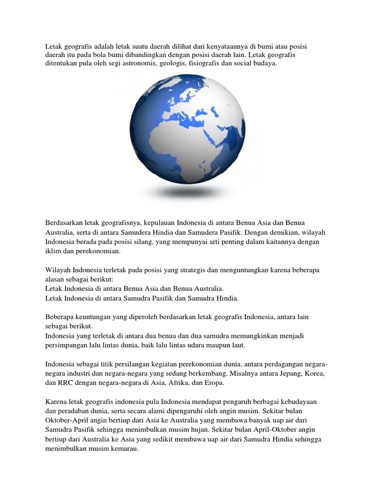 Secara geografis indonesia terletak diantara dua posisi silang yaitu diantara. Tentu ada beberapa dampak dan pengaruh letak geografis indonesia yang ditimbulkan bisa berupa dampak positif atau dampak negatif pada berbagai bidang. Indonesia terletak di antara benua indonesia terletak diantara dua samudra yaitu. Dari peta tersebut nampak bahwa secara geografis indonesia terletak di antara 2 benua yaitu benua australia dan benua asia serta terletak di antara 2 samudra yaitu samudra hindia dan samudra pasifik. Secara geografis indonesia terletak diantara dua benua dan dua samudra. Letak indonesia bisa dibilang sangat strategis secara geografis. Secara astronomis kepulauan indonesia terletak pada 6olu 11ols dan 95obt 141obt.